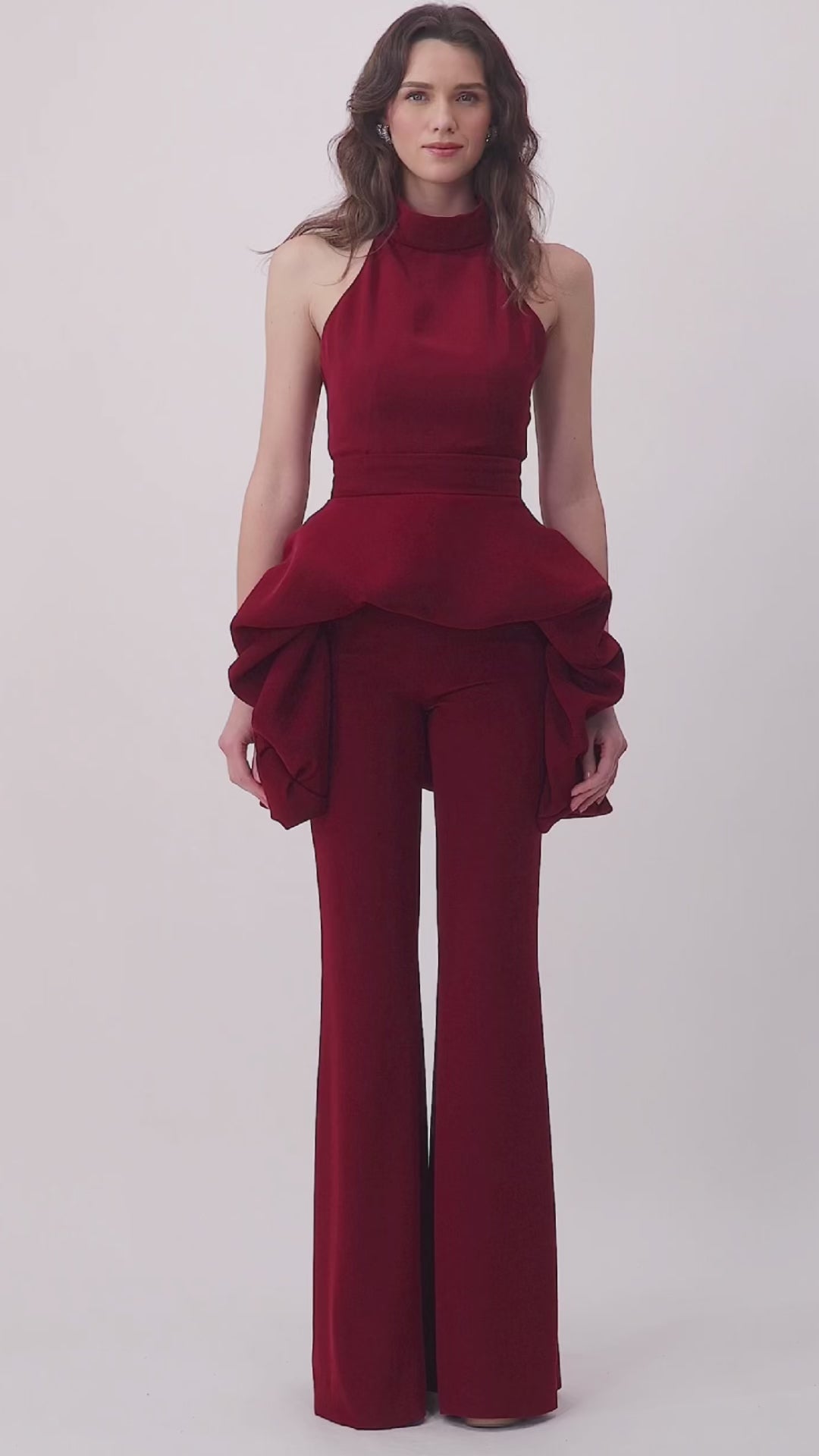 Modern elegance with a hint of flair. Crafted in rich maroon crepe, the flared pants feature a high-rise fit and a fluid silhouette that elongates the legs with effortless movement. Perfect for refined evenings, power dressing, or statement day-to-night looks.