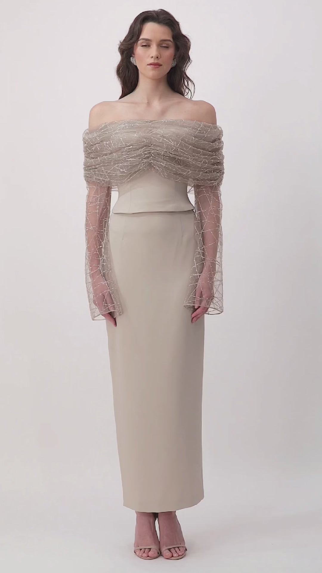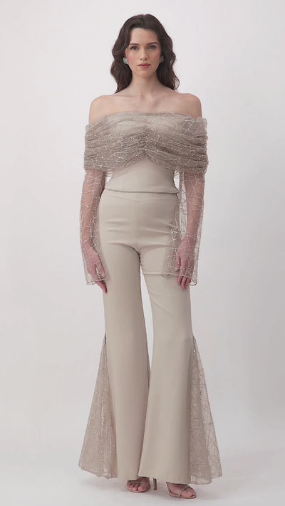 Crafted in a captivating beige, this off-shoulder top blends structure with ethereal charm. The crepe bodice is framed by gathered beaded tulle that drapes gracefully around the shoulders and extends into full sleeves, creating a play of texture and light.