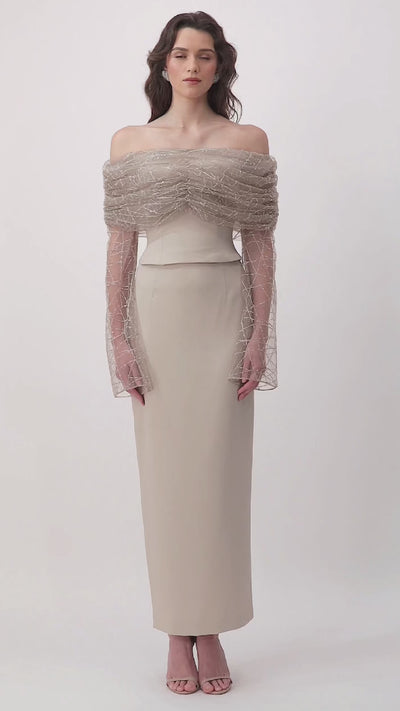 In a unique beige colour, this ankle-length pencil skirt exudes sleek sophistication. Its streamlined silhouette elongates the legs, offering a refined and modern elegance—Match yours with the Esme top or the Caroline top for the ultimate look.