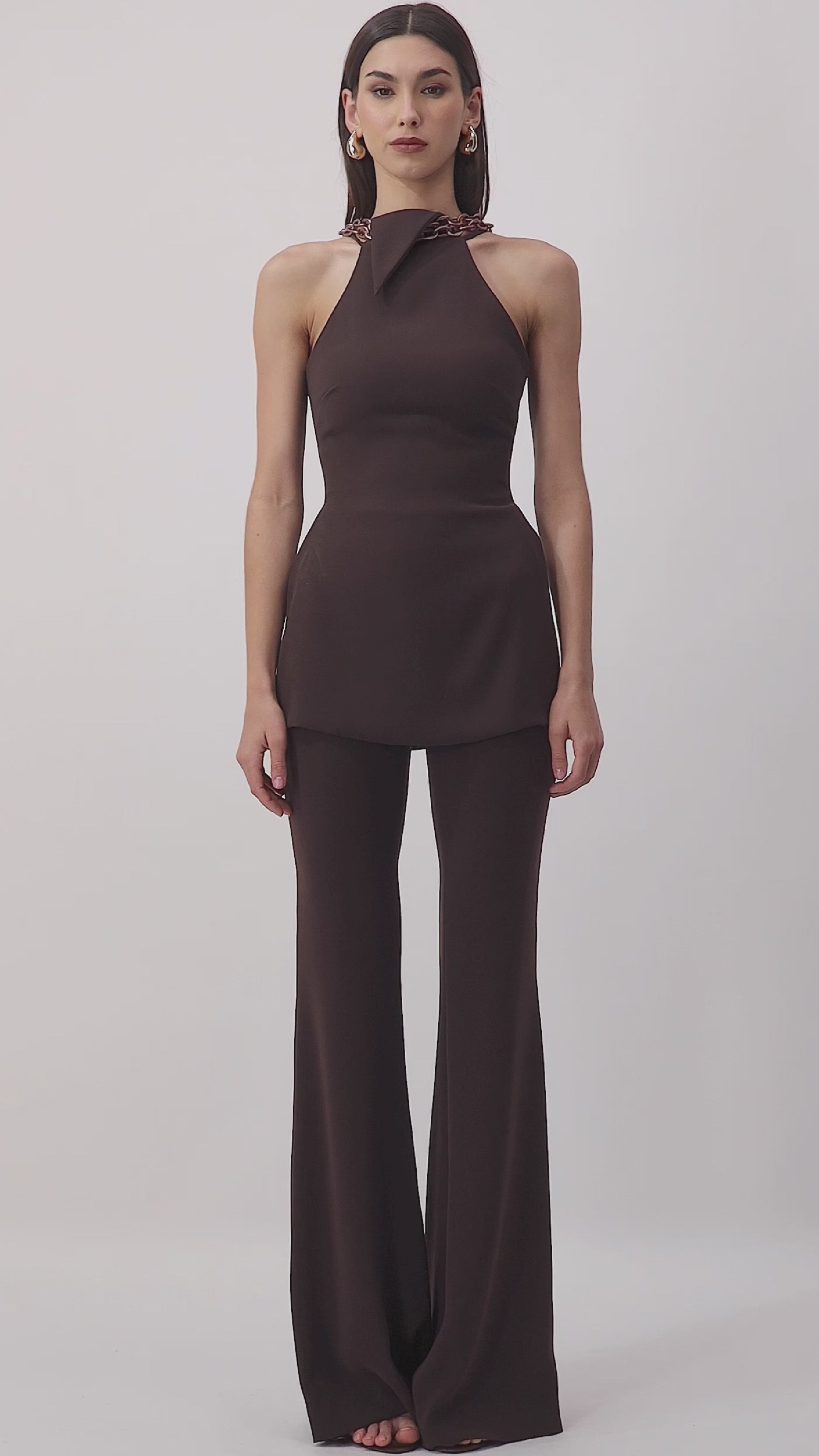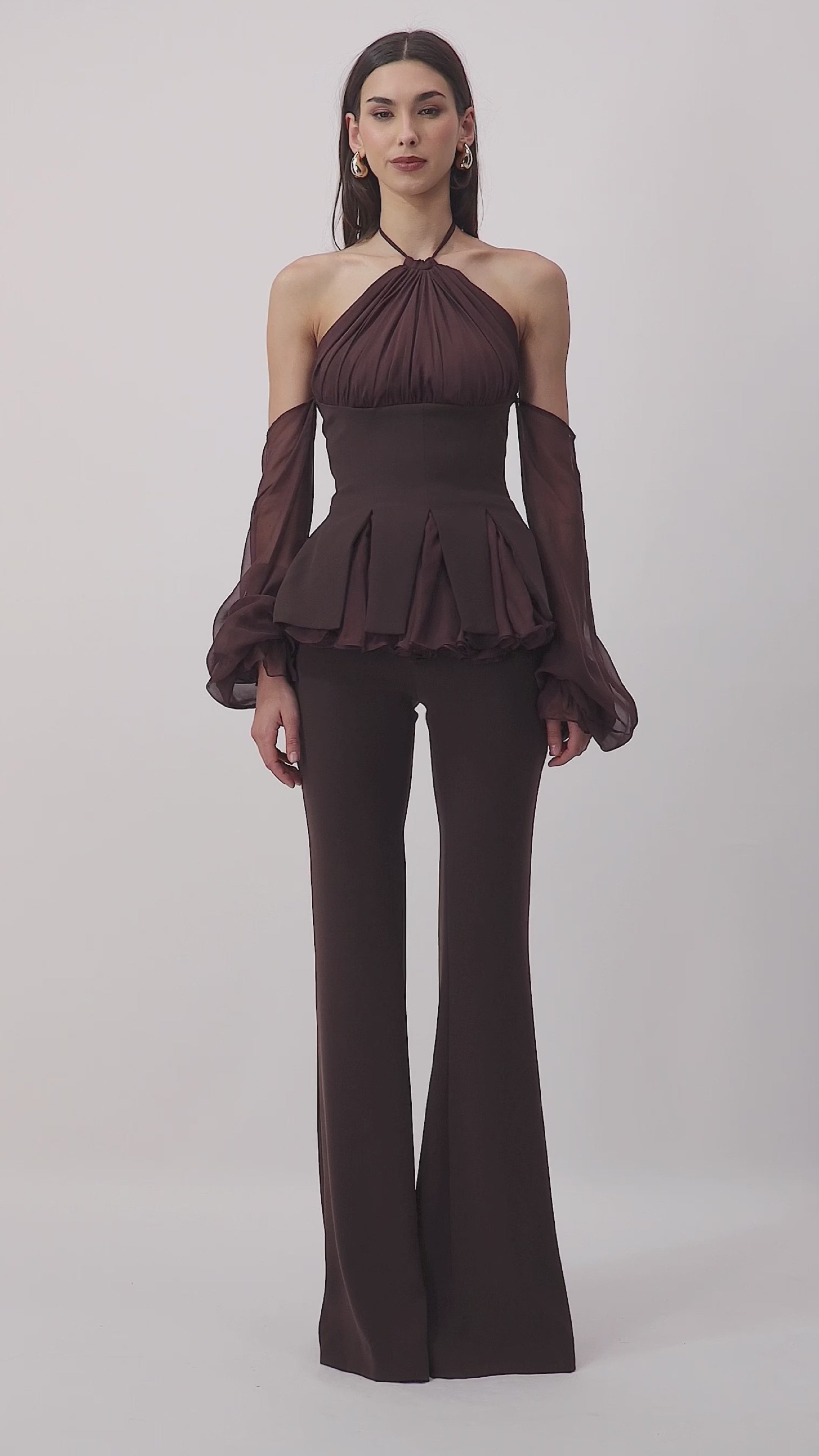 Step into style with the 'Gigi' elegant brown crepe pants, embodying the season's hottest color trend. Designed with a flattering high-waist and a chic flared silhouette.