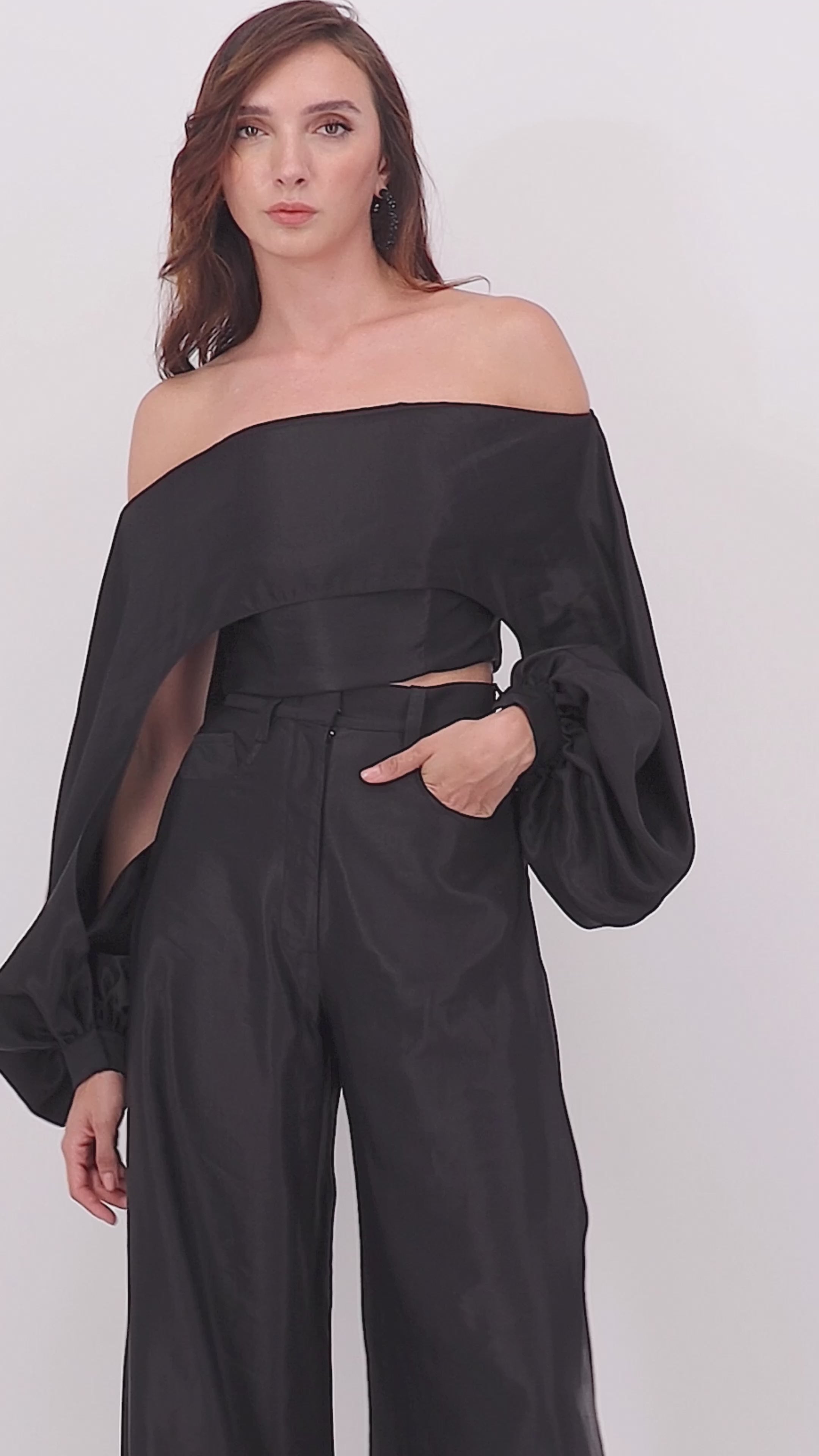 An off the shoulder sensation cut from lux rayon linen fabric this top is bound to catch the eye , with its unusual puff sleeves and fitted silhouette. Pair yours with the Nero pants or Nero shorts for a night out .