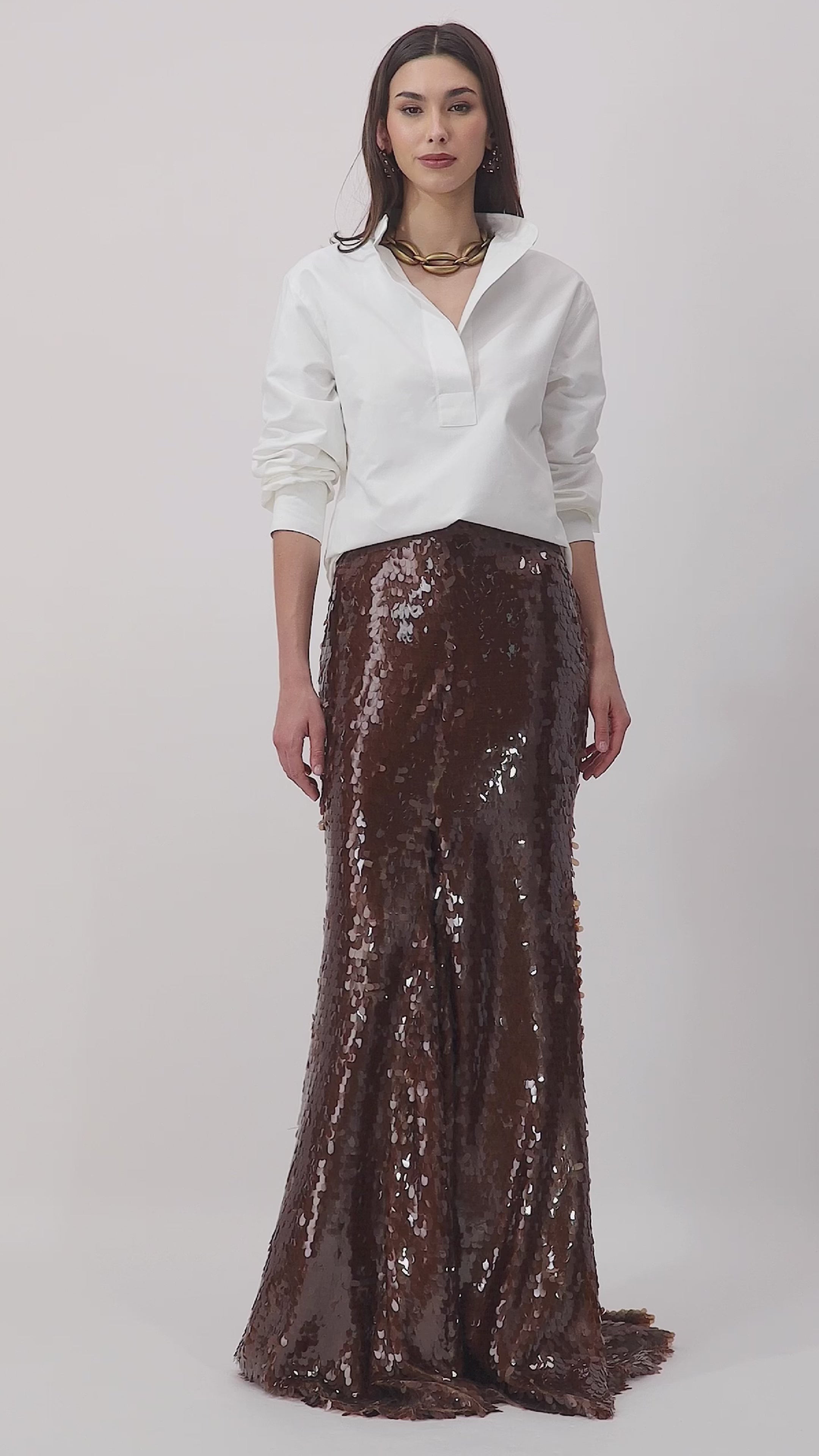 Shimmer in style with this stunning maxi flow sequin skirt, embracing the color of the season with a touch of glamour. Designed with a flowing silhouette, it moves effortlessly with every step, making it perfect for special occasions or evening events. Pair it with a sleek white shirt, fashion-forward ensemble that captures elegance and modernity.