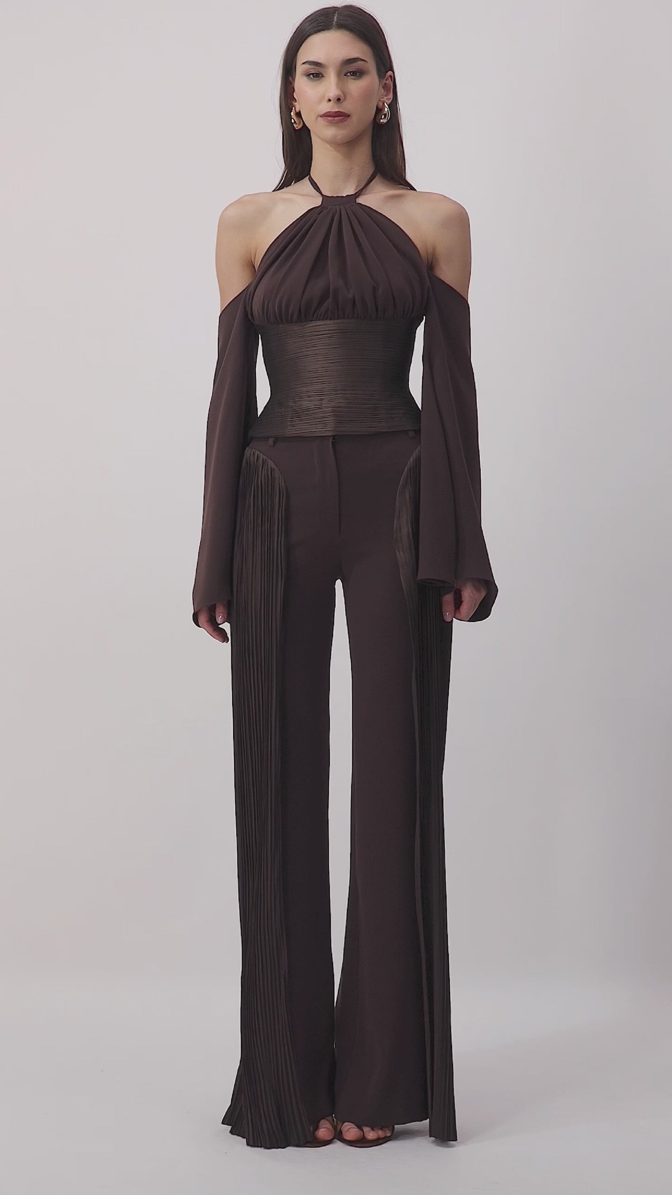 For the playful feminine side of you we present the ' Rola top' . It is crafted from fine crepe and the brand's signature pleated taffeta . Pair yours with the Runa Pants for a special night out .