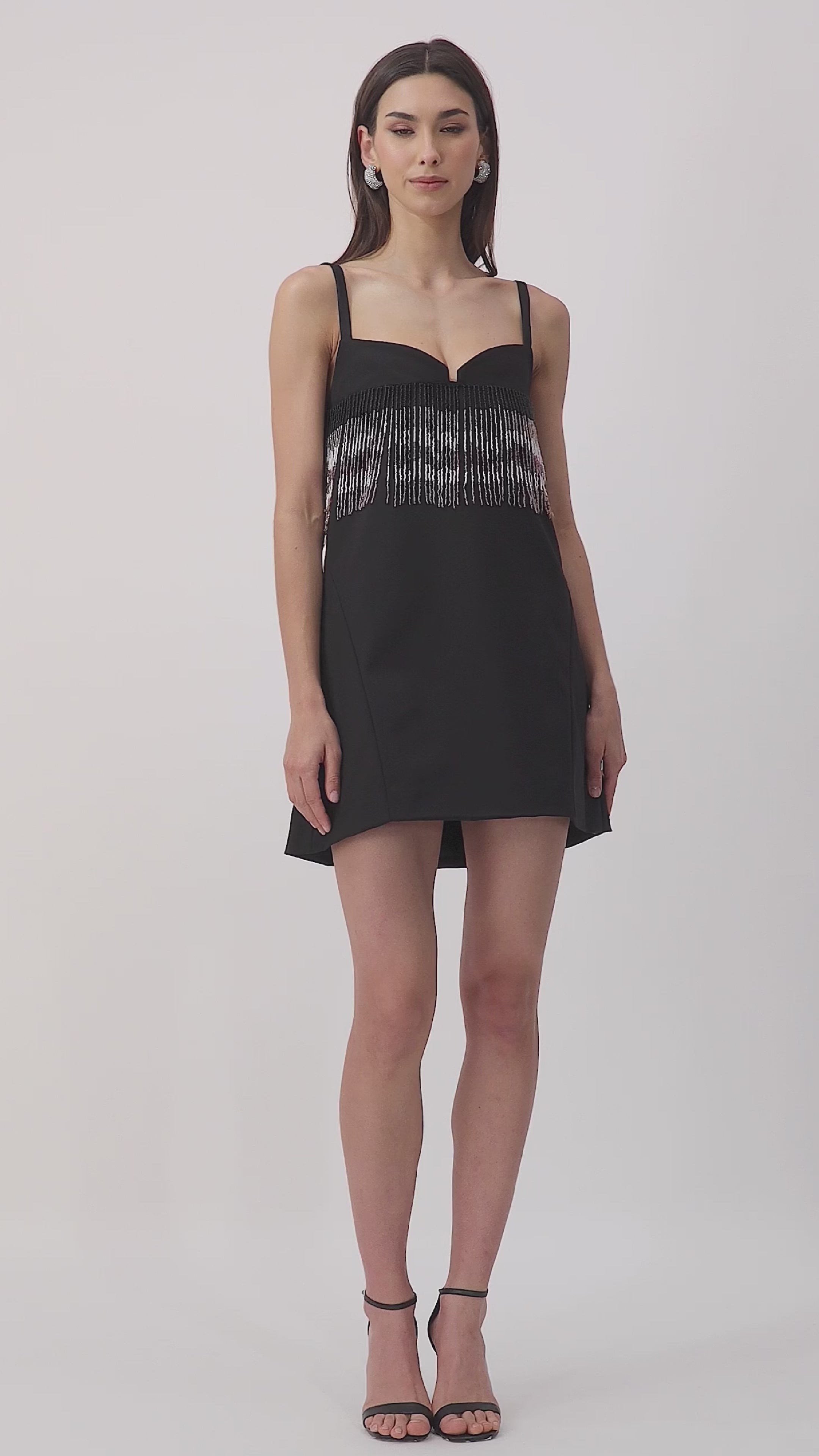 Add a touch of charm to your wardrobe with this playful mini dress. Featuring delicate beaded trims at the bust, this design exudes a subtle sparkle and elegance. The flattering A-line silhouette creates a fun and flirty vibe, perfect for parties or casual chic moments. Effortlessly stylish and versatile, this dress is your go-to for a polished yet playful look.