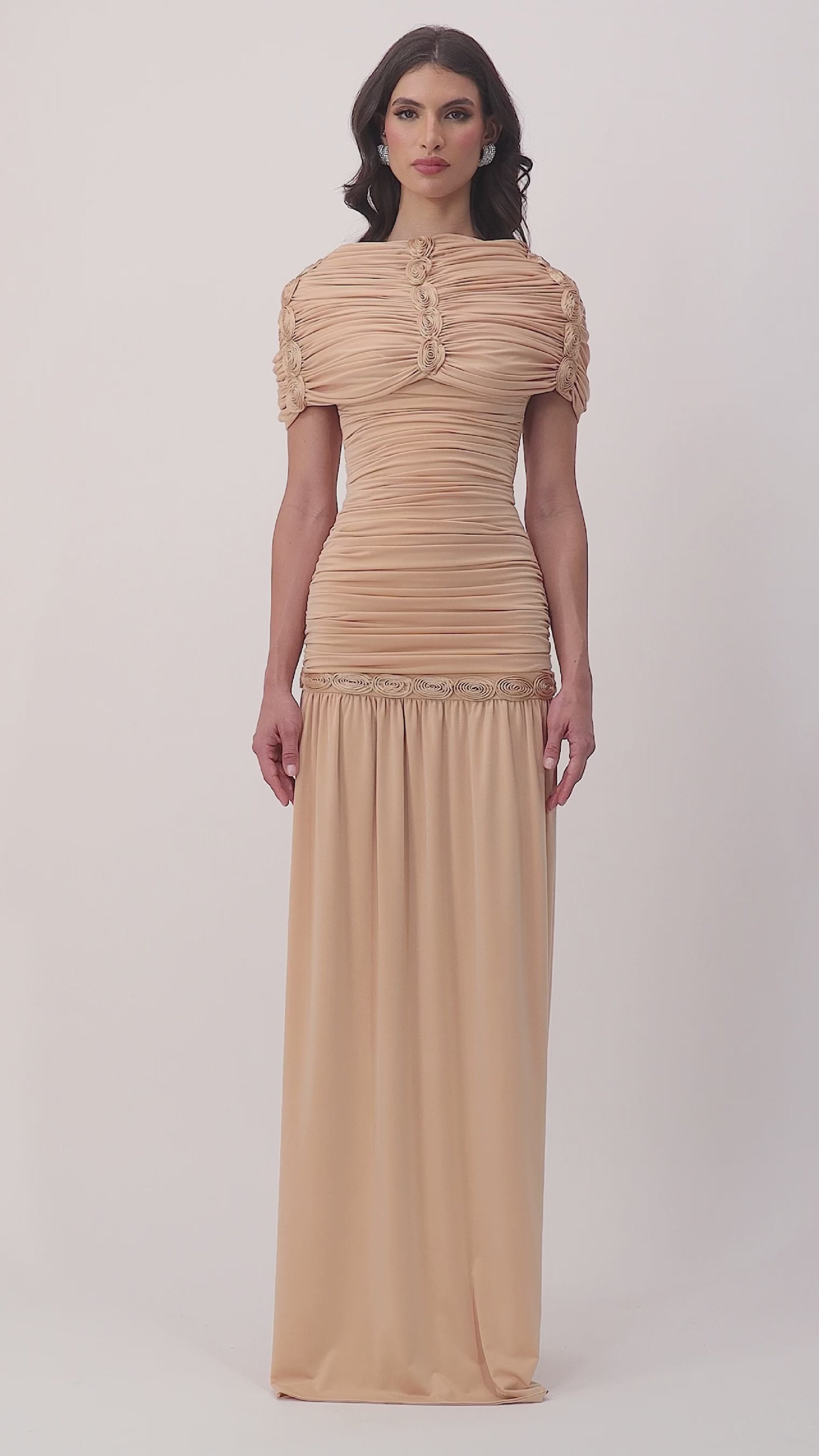 'The Magnolia' is a figure-loving, double-layer jersey maxi dress with soft draping and playful flower details at the bust and hip. Simple, stunning, and made to move with you. It is sold together with a cover top like no other.