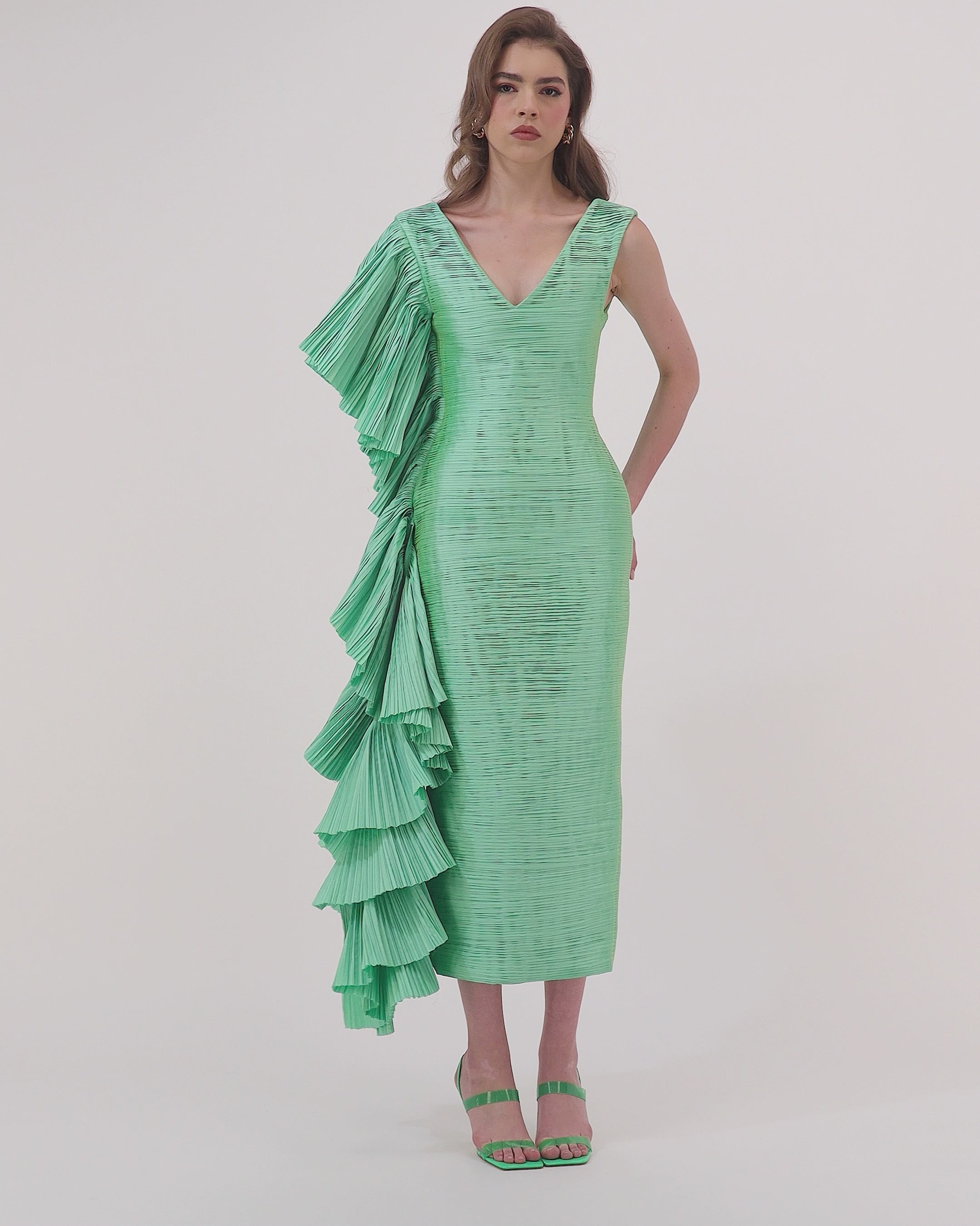 A midi sensation ,offering a seamless blend of sass and timeless style. It is sculpted in the brand's signature taffeta with a one sleeve ruffle along the dress to guarantee flair and glamour to your night.