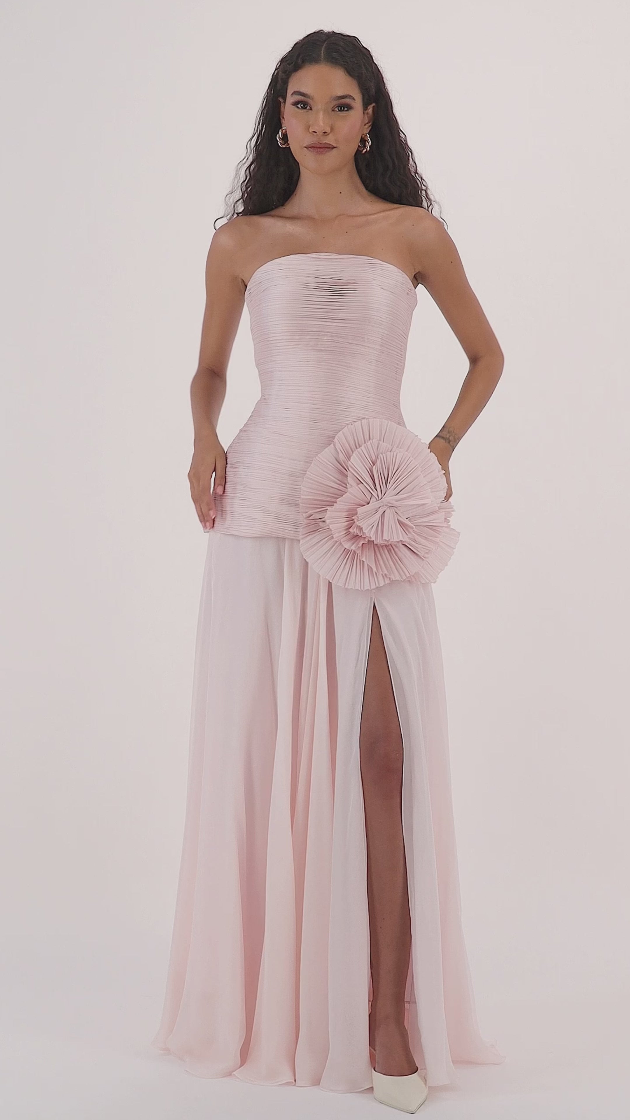 The 'Sora' gown is the statement gown. With our signature peplum bodice that accentuates an hourglass silhouette, adorned with a flower that is designed to captivate. The skirt, made from layers of pure silk chiffon, adds an airy elegance that's simply breathtaking.