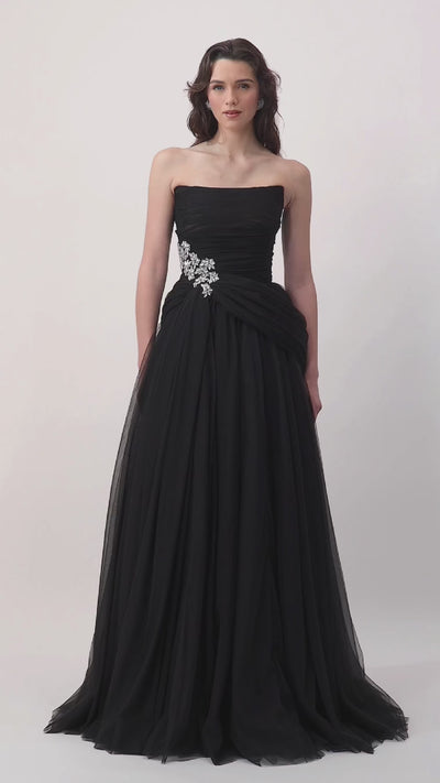 Fairytale glamour with a modern edge. This voluminous evening gown in tulle features a ruched bodice adorned with sparkling diamante embellishments that catch the light with each graceful movement. A nonchalant tulle drape flows over the form, adding drama, volume, and a touch of ethereal romance. The tie-up back ensures a perfect fit, making this enchanting gown ideal for formal soirées, red-carpet events, and unforgettable evenings.