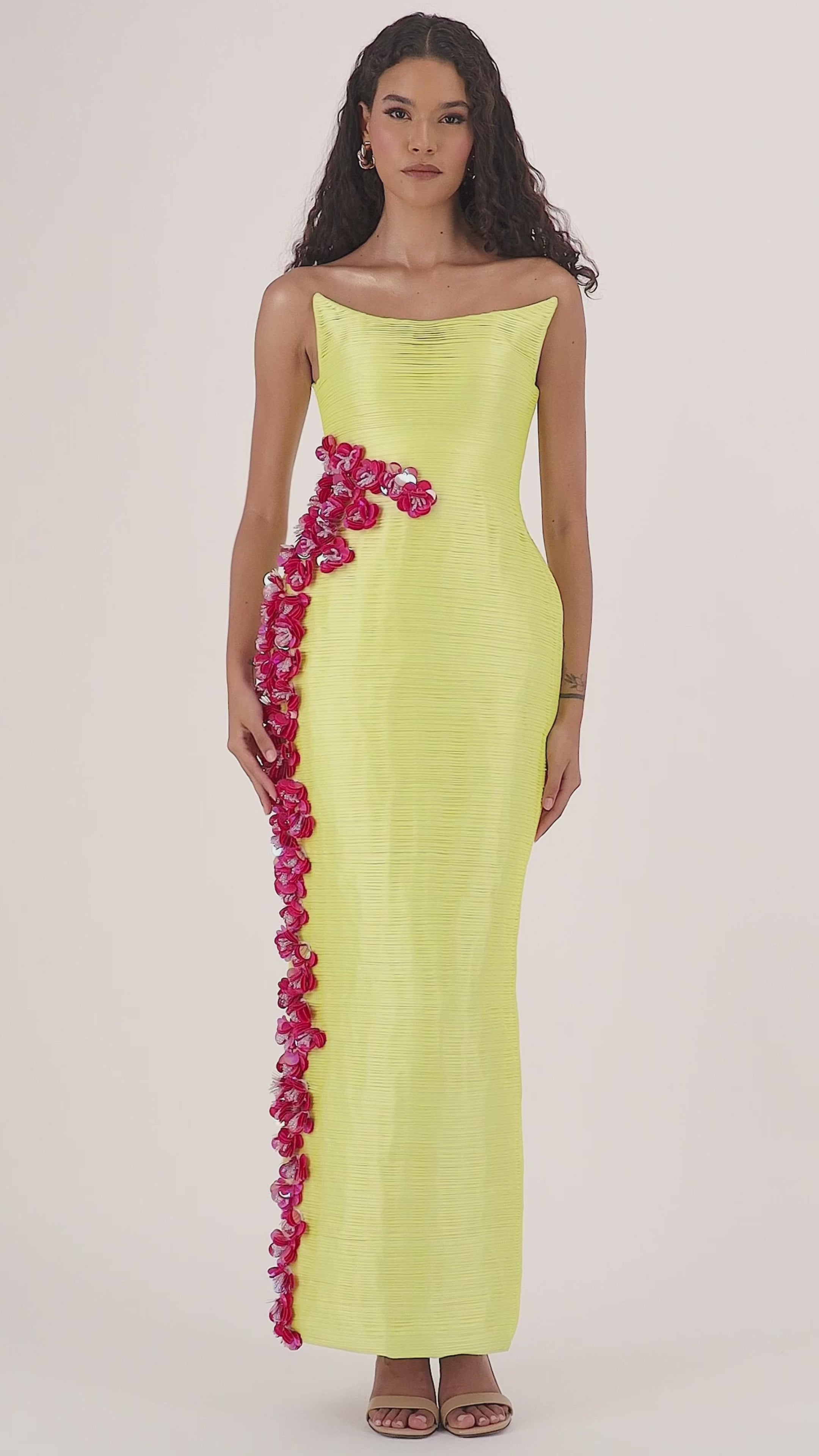 A maxi sensation , offering a seamless blend of sass and timeless style. It is sculpted in the brand's signature light yellow taffeta and adorned with pink flowers along the side guaranteeing an unmatched impression.