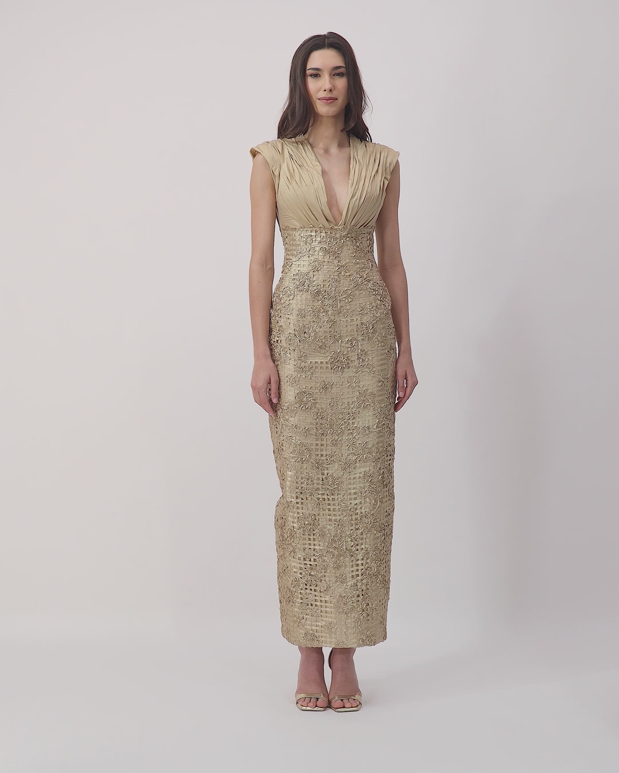 Shimmer with elegance in the exquisite 'FEVA' gown, designed to captivate at any grand occasion. The empire bodice gives volume with its draped tafetta . Delicate gold foil flower details adorn the dress, exuding luxury and artistry. This gown creates a dramatic yet graceful silhouette that commands attention. Perfect for making a glamorous statement.